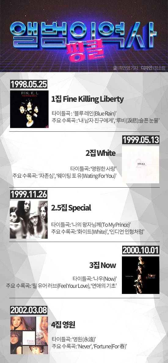 핑클은 지난 1998년 5월 데뷔 앨범 ‘파인 킬링 리버티(Fine Killing Liberty)’를 발매했다. 당시 발라드를 부르는 아이돌 그룹은 거의 없었지만 핑클은 슬픈 느낌의 발라드 ‘블루 레인(Blue Rain)’을 데뷔곡으로 정하고 본격적인 활동을 시작했다.