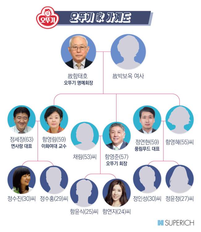 고 함 명예회장의 손자들도 주식을 증여받아 지분을 갖고 있다. 함영준 회장의 자녀 함윤식(25) 씨, 함연지(24) 씨는 각각 2.04%, 1.16%를 쥐고 있다. 함 회장의 아내 채림(53) 씨도 0.29%의 지분을 갖고 있다.