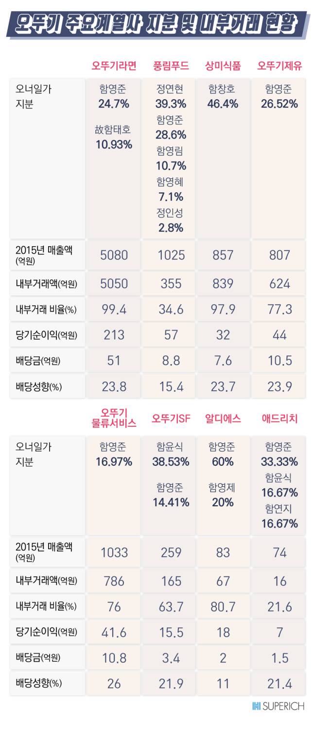 오뚜기SF와 애드리치는 함영준 회장의 자녀들이 지분 다수를 보유하고 있는 계열사이다.