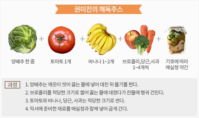 해독 주스에 들어가는 채소는 위·소장·대장의 연동운동을 촉진하는 양배추와 마그네슘(Magnesium)이 들어 있어 생리 불순에 도움을 주는 브로콜리, 그리고 붉은 색소 리코펜(Lycopene)이 많이 함유돼 있어 탄력을 유지하는 데 도움을 주는 토마토다. 과일은 사과와 바나나를 넣는데, 사과는 혈액에 산소를 운반하는 헤모글로빈(Hemoglobin)과 비타민C가 풍부해 피부를 맑게 해주고, 바나나는 몸속 나트륨을 배출시키는 칼륨이 풍부하다.