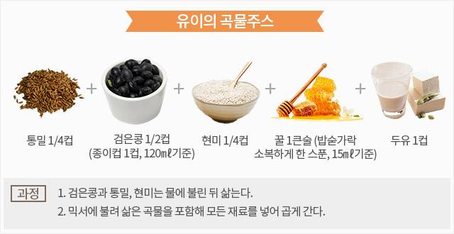 데뷔 초에 '꿀벅지'라는 별명이 붙을 만큼 탄탄한 몸매로 주목받았던 유이는 가수에서 배우로 변신하면서 종잇장 같은 가냘픈 모습으로 나타났다. 다이어트를 위해 매 끼니를 샐러드로 먹으며 식이섬유가 많은 고단백질 음식인 곡물 주스를 간식으로 먹었다고 한다. 곡물 주스를 통해 몸에 부족해질 수 있는 필수 영양소*를 공급하고 변비를 예방했다.
