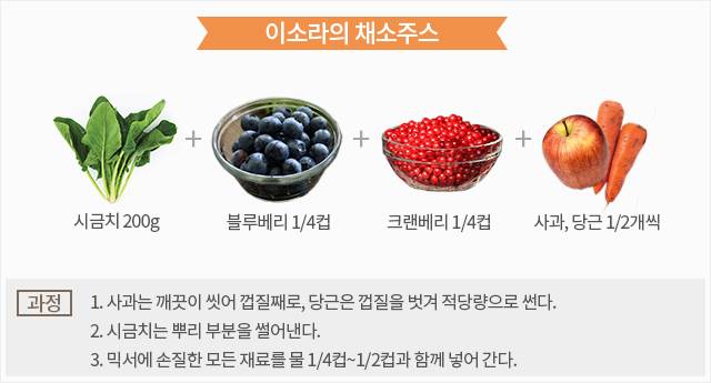 모델 이소라는 한 예능 프로그램에 출연해 불혹을 넘긴 나이에도 44사이즈 몸매와 동안 미모를 유지하는 비결로 채소 주스를 소개했다. 끼니 사이사이에 먹는 이소라의 채소 주스에는 블루베리와 크랜베리 등 베리류가 들어간다는 점이 특징이다.
