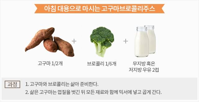 고구마브로콜리주스는 탄수화물과 단백질을 균형적으로 섭취할 수 있는 음료다. 특히, 고구마에는 얄라핀(Jalapin)이라는 성분이 변을 부드럽게 하는 효과가 있어 변비를 예방하고, 고구마의 노란 속살을 만드는 베타카로틴은 항암 효과가 있다.