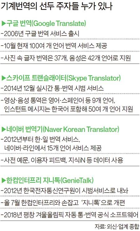 2018년 평창 겨울올림픽 자동 통·번역 공식 소프트웨어로 선정된 지니톡도 인공지능 기술을 접목해 번역의 품질을 높이고 있다. 지니톡을 개발한 신소우 한컴인터프리 대표는 “인공지능이 접목되면 3년 내 ‘얼라(어린이)’와 같은 사투리도 ‘키드(kid)’로 번역할 수 있을 것”이라고 내다봤다.