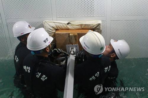 (여수=연합뉴스) 2일 해양경비안전교육원은 오는 3일까지 아시아·북미·아프리카 등 13개국 13명의 해양치안 간부들을 대상으로 국제교육과정을 진행하고 있다고 밝혔다. 사진은 선박에 구멍이난 사고 상황을 가정해 방수훈련을 받는 각국 해양치안 간부들의 모습. 2016.11.2 [해양경비안전교육원 제공=연합뉴스]