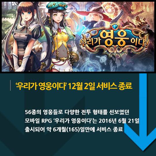 56종의 영웅들로 다양한 전투 형태를 선보였던 모바일 RPG '우리가 영웅이다'는 2016년 6월 21일 출시되어 약 6개월(165)일만에 서비스 종료