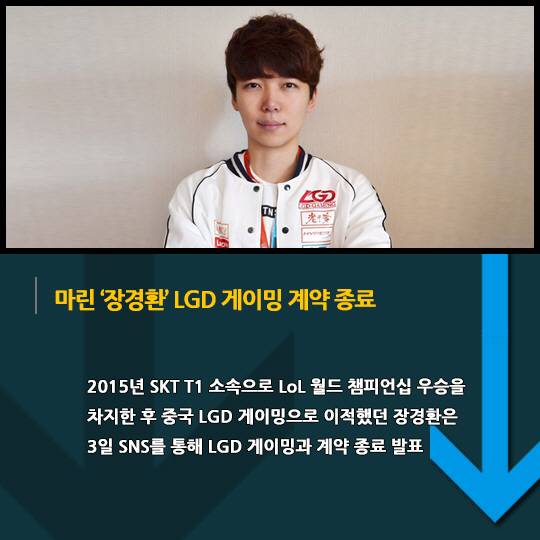 2015년 SKT T1 소속으로 LoL 월드 챔피언십 우승을 차지한 후 중국 LGD 게이밍으로 이적했던 장경환은 3일 SNS를 통해 LGD 게이밍과 계약 종료 발표