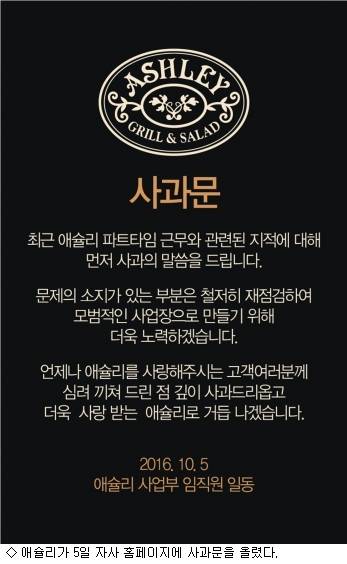이와 관련 에슐리를 운영하는 이랜드 외식사업본부는 5일 자사 홈페이지에 사과문을 기재하며 연차휴가 미지급, 휴게시간 미보장, 연장수당 미지급을 위한 조퇴 문제 등 그간 제기된 일부 아르바이트 노동자에 대한 근로기준법 위반 사실을 인정했다.