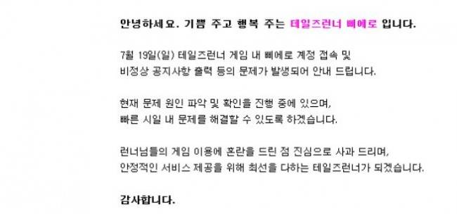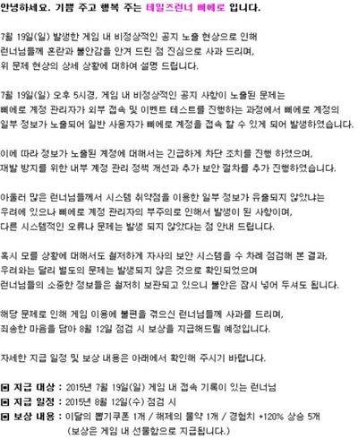 오전의 제보 이후 별다른 추가 사건이 없자 역시 장난이었구나 하는 판단이 들때 쯤인 오후 4시 30분 경. 운영자만이 할 수 있는 게임 내 전체 공지가 등장합니다. 그 내용이 굉장히 충격적인데요. 바로 "테일즈런너 보안 쓰레기 입니다"라는 공지였죠.