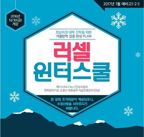 메가스터디 러셀 윈터스쿨은 최상위권 대학 진학을 위한 예비고1, 고2, 고3 겨울방학 집중학습 프로그램이다. 메가스터디 대표 강사들의 수준별 맞춤 단과 수업은 물론 바른공부 자습전용관에서 의무자습이 포함된다. 모든 수업과 의무자습은 기숙학원 출신 담임진의 체계적인 관리가 결합되어 겨울방학 기간의 학습효과를 극대화시킬 수 있다. 윈터스쿨이 종료된 이후에는 2017 내신, 수능 정규 과정으로 편성된다.