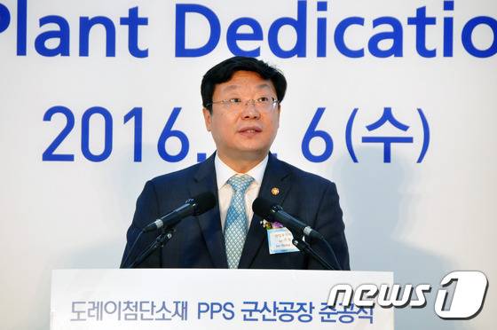 (서울=뉴스1) 추연화 기자 = 주형환 산업통상자원부 장관이 6일 오전 전라북도 군산시 새만금산업단지에서 열린 '도레이 첨단소재 군산공장 준공식'에서 축사하고 있다. (산업통상자원부 제공) 2016.7.6/뉴스1