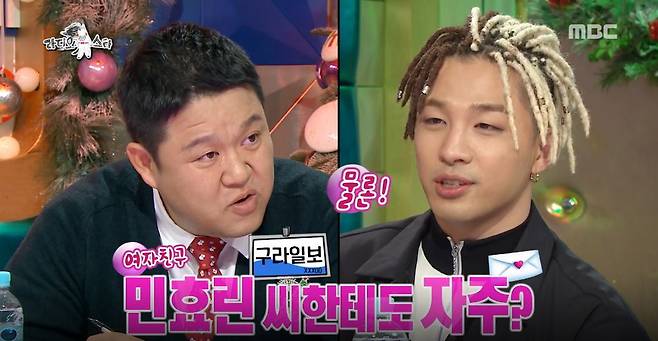 먼저 김구라가 “탑이 태양의 손편지를 받고 울었다고?”라며 물었다. 이에 탑이 “맞다. 남자한테 받은 손편지는 처음이다”라고 답했다.