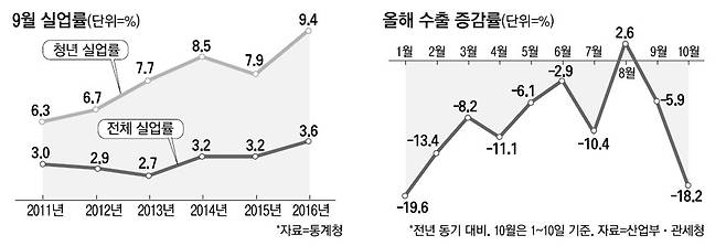 한국 경제가 '퍼펙트 스톰'의 초기 단계에 진입했을 수도 있다는 관측은 실업통계를 통해 뒷받침되고 있다. 9월 실업률은 11년 만에 최고치를 기록했다. 조선·해운 구조조정에다 수출 부진까지 겹치면서 고용 한파가 닥친 것이다.