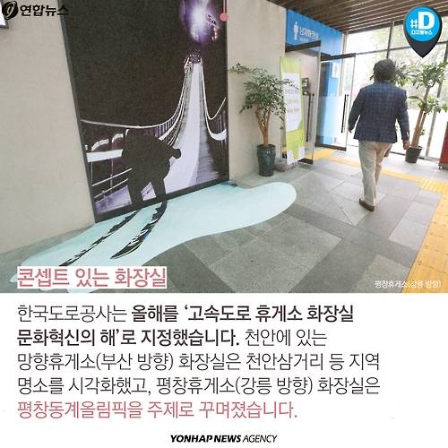 콘셉트 있는 화장실. 한국도로공사는 올해를 '고속도로 휴게소 화장실 문화혁신의 해'로 지정했습니다. 천안에 있는 망향휴게소(부산 방향) 화장실은 천안삼거리 등 지역 명소를 시각화했고, 평창휴게소(강릉 방향) 화장실은 평창동계올림픽을 주제로 꾸며졌습니다.