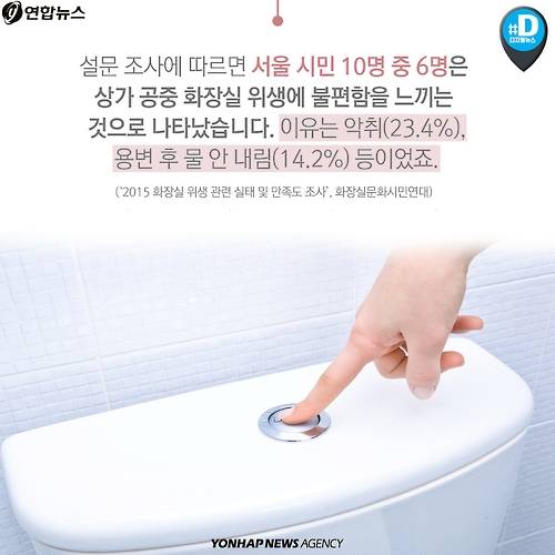설문 조사에 따르면 서울 시민 10명 중 6명은 상가 공중 화장실 위생에 불편함을 느끼는 것으로 나타났습니다. 이유는 악취(23.4%), 용변 후 물 안 내림(14.2%) 등이었죠. ('2015 화장실 위생 관련 실태 및 만족도 조사', 화장실문화시민연대)