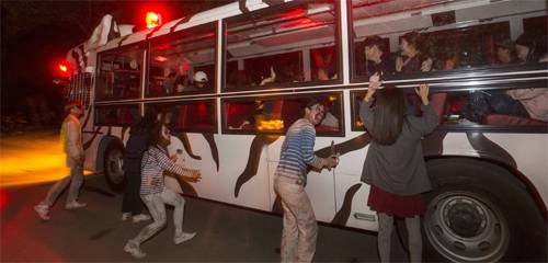 | 이달 8일 개장한 경기 용인 에버랜드의 ‘호러 사파리’ 모습. 사자 호랑이 곰 등 맹수들이 사는 ‘사파리월드’를 야간(오후 7∼9시)에만 좀비들이 출몰하는 호러 사파리로 변신시켰다. 갑작스레 출몰하는 좀비들을 피해 버스를 타고 사파리 곳곳을 누비는 공포체험 공간이다. 에버랜드 제공 |