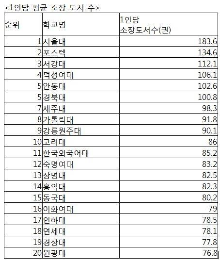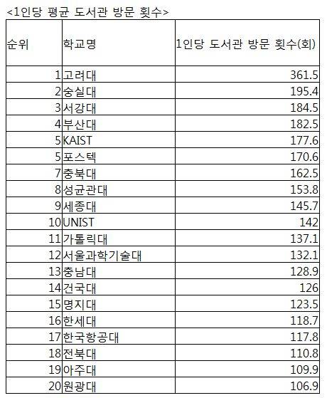중앙일보 대학평가팀이 학술정보통계를 활용해 2016 대학평가 대상인 77개 대학의 도서관 실태를 분석해보니 분석 결과 지난해 1인당 평균 도서관 방문횟수는 90.5회였다. 나흘에 한번 도서관에 들른다는 얘기다. 대학 도서관은 평균 1인당 70.3권의 도서를 구비하고 있다. 학생들이 대출하는 책은 한 해 1인당 평균 7.4권이었다.