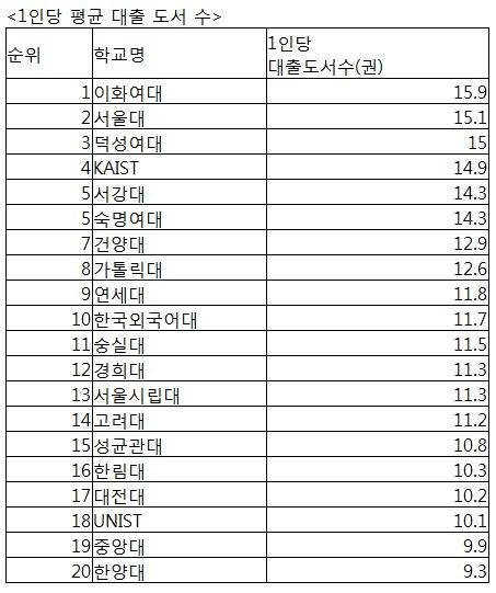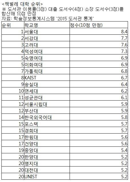 그렇다면 도서관 이용률도 높고 소장 도서도 많은 '책벌레 대학'은 어디일까. 대학평가팀은 1인당 도서관 방문 횟수(3점), 1인당 대출 도서 수(4점), 1인당 소장 도서 수(3점) 등 3개 지표 합산점수 10점 만점으로 책벌레 대학을 꼽아봤다.