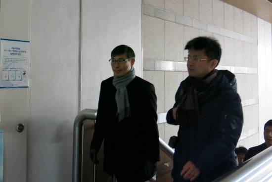 | ▲ 첫 공판이 열렸던 1월 재판정으로 향하는 김정훈 전 전교조 위원장과 변성호 전교조 위원장 |