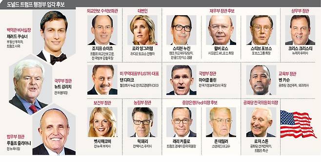 내년 출범할 도널드 트럼프 미국 행정부의 윤곽이 드러나고 있다. 한국경제신문이 9일(현지시간) 트럼프 당선자 캠프 관계자로부터 입수한 자료에 따르면 내년 1월 출범하는 트럼프 행정부에서 대통령 비서실장엔 쿠슈너, 국무장관엔 깅리치 전 의장, 법무장관엔 줄리아니 전 시장이 물망에 올랐다.