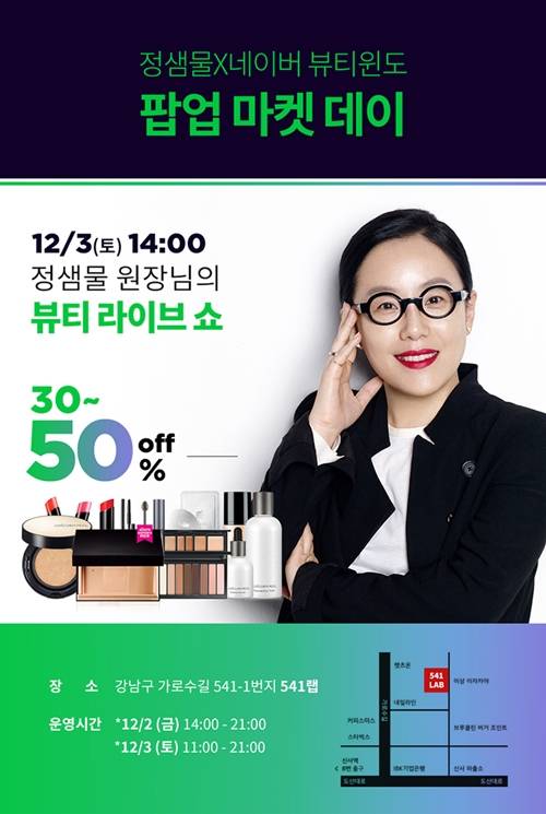 메이크업 아티스트 정샘물의 27년 뷰티 철학과 노하우를 담은 뷰티 브랜드 ‘JUNG SAEM MOOL(이하 정샘물)’이 오는 12월2일과 12월3일 양일간, 서울 신사동 가로수길 ‘541랩’에서 진행되는 네이버 ‘뷰티윈도 팝업마켓 데이’에 참가한다.