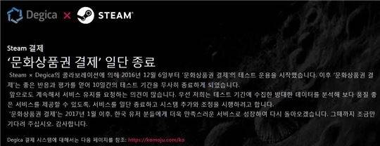 '문화상품권' 결제를 추가하며 큰 반향을 얻었던 스팀은 오는 17일부터 문화상품권 결제를 중단한다고 16일 공지했다. 결제 중단 이유는 10일간의 테스트가 끝났기 때문이라는게 스팀 측의 설명이다.