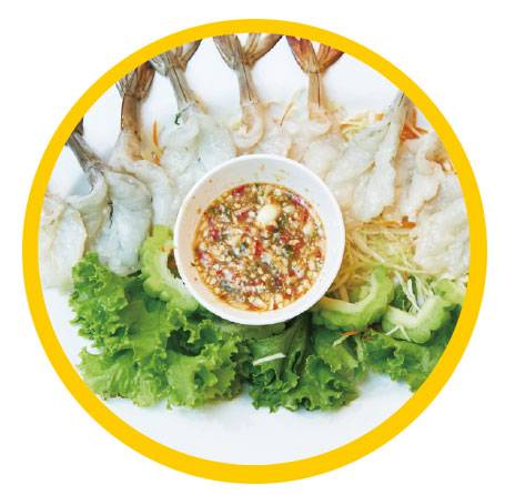 신선한 새우를 손질한 후 민트, 마늘, 여주, 태국 쥐똥 고추와 함께 내는 태국식 새우 회다. 상큼한 라임 즙과 마늘, 칠리로 만든 매콤한 소스가 생새우와 곁들여져 생새우의 입맛을 돋우는 전식으로 손꼽힌다. 날것으로 먹는 만큼 해산물 전문 식당에서 맛보는 것이 좋다.