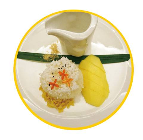 태국을 대표하는 디저트로 잘 익은 생망고와 찰밥이 달콤한 코코넛 밀크와 함께 어우러진다. 찰밥을 카오 니아오Khao Niao, 망고를 마무앙Mamuang이라고 하는데 코코넛 밀크로 지어 향을 더했고 망고의 달콤함과 찰밥의 차진 식감이 조화롭다.