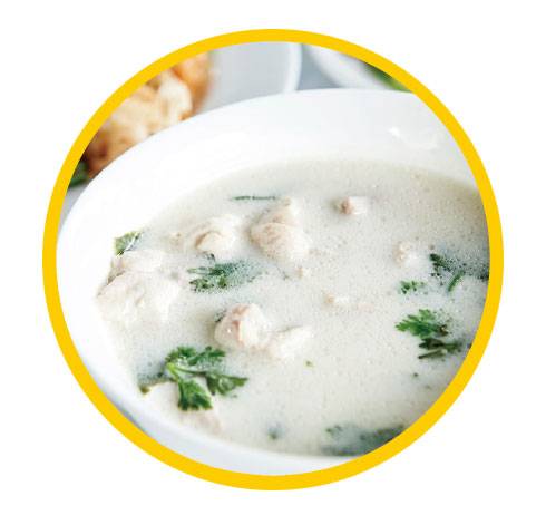 코코넛 밀크가 듬뿍 들어간 치킨 수프로 뽀얀 국물 안에 갈랑가 생강, 라임, 고추가 들어가 부드럽지만 매콤하고 알싸하다. 톰얌꿍과 비슷한 재료로 만들지만 코코넛 밀크의 맛이 훨씬 강하며 태국 요리 마니아에게 특히나 사랑받는 요리.