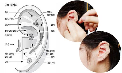 또 귀에는 전신의 경락이 존재한다. 전신 혈 자리 분포도를 보면 태아가 거꾸로 누워있는 형태로 머리는 아래쪽에 위치하며 하지에 해당하는 부분은 귀 위쪽에 있다. 혈 자리에 따라 이혈 테이핑 요법을 적용하면 된다.