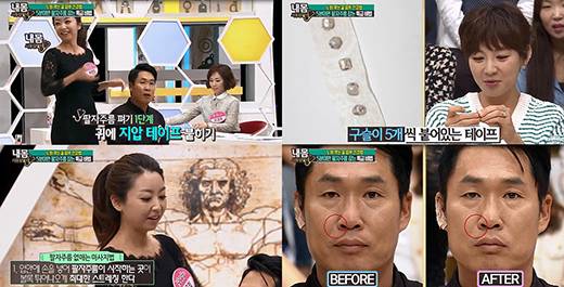 배은정 원장은 팔자주름 펴기 1단계로 귀에 지압 테이프 붙이기를 추천했다. 귀가 굳으면 얼굴 근육도 굳기 때문에 귀를 지압해 근육을 풀어주는 것이다. 이는 기석이나 쌀알을 테이프에 붙여 사용하면 된다.