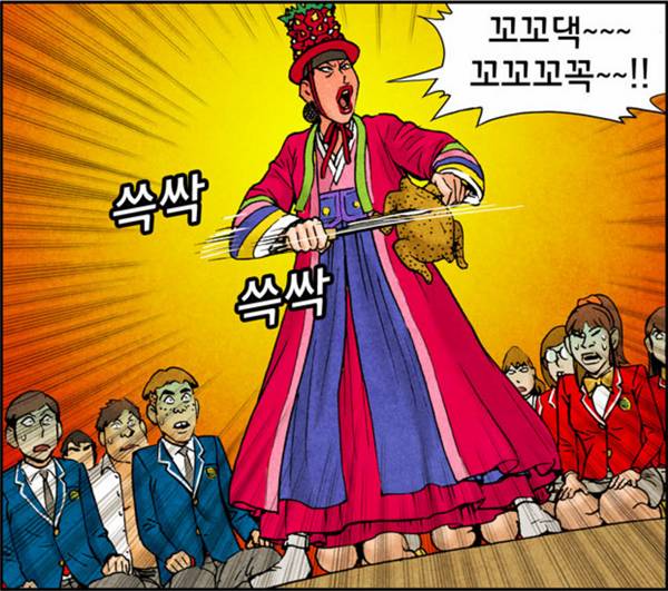 | 현용민 작가의 만화 <웃지 않는 개그반>에서 교장은 왕따를 당한 학생에게 사과하는 대신 굿판을 벌인다. 무당에게 교실의 운명을 맡기고는, 정작 자신은 책임의 자리에서 이탈한다. / 네이버웹툰 |
