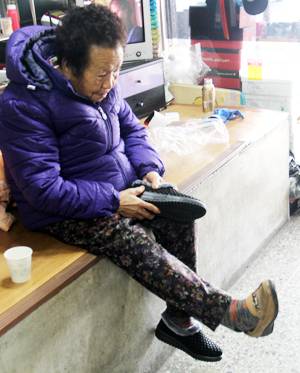 조 사장이 냉큼 일어나 할머니를 따뜻한 평상 위에 앉히고 신발 문수(사이즈)도 물을 것 없이 골라 신겨주니 꼭 맞는다. 할머니도 맘에 들어하는 눈치다.