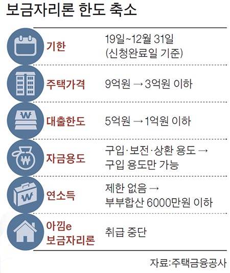 이 보금자리론이 논란이 되고 있는 이유는 바로 이 관대했던 대출 조건이 굉장히 까다로워졌기 때문입니다. 5억원까지 빌려서 9억원의 주택까지 살 수 있었던 것이, 1억원을 빌려 3억원의 주택까지만 살 수 있도록 조정된 겁니다. 연소득이 부부합산 6000만원 이상이면 보금자리론을 이용할 수 없다는 조항도 신설됐습니다. 아낌e보금자리론은 아예 이용이 불가능해졌습니다.