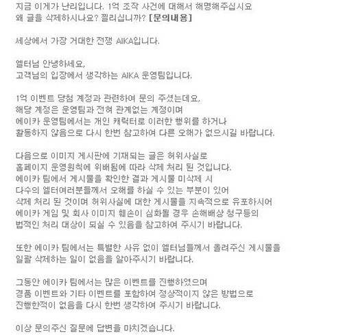 게다가 의혹이 제기된 후 '에이카'의 홈페이지에 게시됐던 1억 골드 획득 게시물이 삭제됐죠. 10여일간 접속도 하지 않던 캐릭터가 돌연 말입니다.