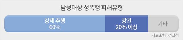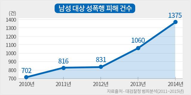 남성을 상대로 한 성범죄 사건이 급증하는 추세다. 군대, 직장 기숙사처럼 동성 간 단체 생활이 이루어지는 곳에서 주로 발생하는 것으로 나타났다. 대검찰청이 매년 발간하는 '범죄분석'에 따르면 남성이 피해자인 성폭행 건수는 지난 2010년 702건에서 2014년 1375건으로 5년 동안 195%(673건)나 늘었다.