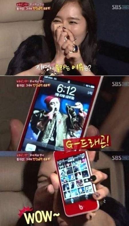 한가인은 "지드래곤의 몸짓에서 뿜어나오는 에너지와 끼가 부럽고 멋있다"며 "직접 만나면 말 못할 것 같다"고 말해 진정한 팬임을 보여줬다. 심지어 한가인의 휴대전화 배경화면에는 남편 연정훈이 아닌 지드래곤의 사진 설정돼 있어 시청자들의 웃음을 자아냈다.