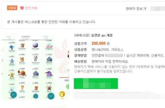 27일 중고나라에서는 기타 게임용품 게시판을 통해 국내 정식 서비스가 되지 않은 '포켓몬 고'의 계정을 판다는 게시물이 올라와 있다. 가장 비싼 계정은 희귀 포켓몬이 있다는 점을 앞세워 호가가 20만원에 이른다.