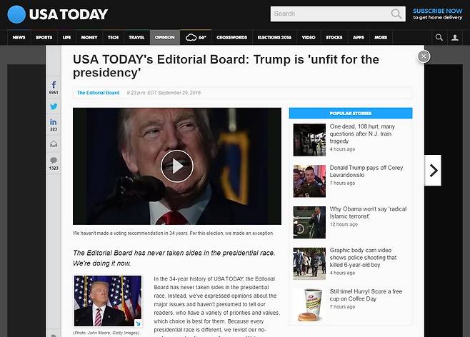 <USA투데이>는 29일(현지시각) 편집위원회 명의 사설에서 "창간 34년 역사상 대선에서 어느 후보를 지지하거나 반대한 적이 없었다"라며 "트럼프가 미국 대통령직에 부적합한 인물이라는 것에 만장일치를 이뤘다"라고 밝혔다.