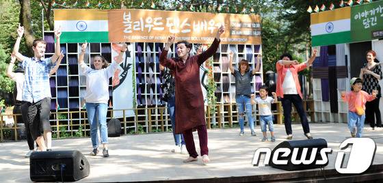 (춘천=뉴스1) 박하림 기자 = 25일 강원도 춘천시 남이섬에서 열린 2016 사랑-나미나라 인도문화축제(2016 SARANG-Festival of India · Nami Island)에서 관람객들이 인도 전통춤 ‘볼리우드 댄스’를 배우고 있다. 2016.9.25/뉴스1