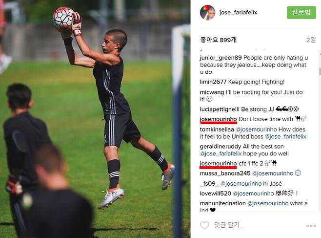 하지만 `SNS 중단 선언`은 오래가지 않았다. 아들인 무리뉴 주니어가 인스타그램에서 악성 댓글에 시달리자 엄지를 바쁘게 움직였다. 풀럼 유소년팀 소속 골키퍼로 활약 중인 아들은 첼시 유소년과의 대결에서 활약해 2-1 승리를 이끌고 자신의 활약이 담긴 사진을 게시했는데, 일부 팬들이 부친인 무리뉴 감독과 관련된 `금수저` 논란을 일으키자 직접 댓글을 달았다.