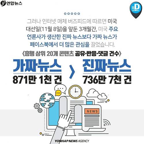 (서울=연합뉴스) 전승엽 기자·김지원 작가·강현우 인턴기자 = 미국 대선 기간 주요 언론사가 생산한 진짜 뉴스보다 확인되지 않은 가짜 뉴스가 페이스북에서 더 많은 관심을 끌었다는 분석이 나왔습니다.