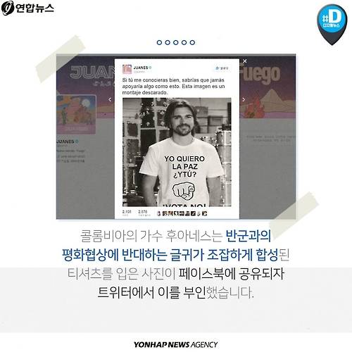 콜롬비아의 가수 후아네스는 반군과의 평화협상에 반대하는 글귀가 조잡하게 합성된 티셔츠를 입은 사진이 페이스북에 공유되자 트위터에서 이를 부인했습니다.