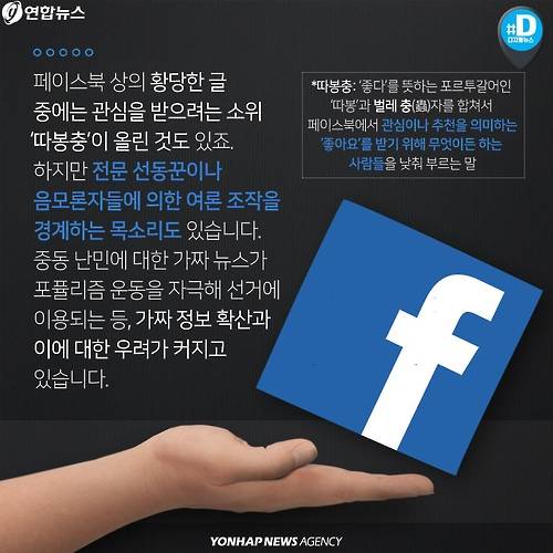 페이스북 상의 황당한 글 중에는 관심을 받으려는 소위 ‘따봉충’이 올린 것도 있죠. 하지만 전문 선동꾼이나 음모론자들에 의한 여론 조작을 경계하는 목소리도 있습니다. 중동 난민에 대한 가짜 뉴스가 포퓰리즘 운동을 자극해 선거에 이용되는 등, 가짜 정보 확산과 이에 대한 우려가 커지고 있습니다.