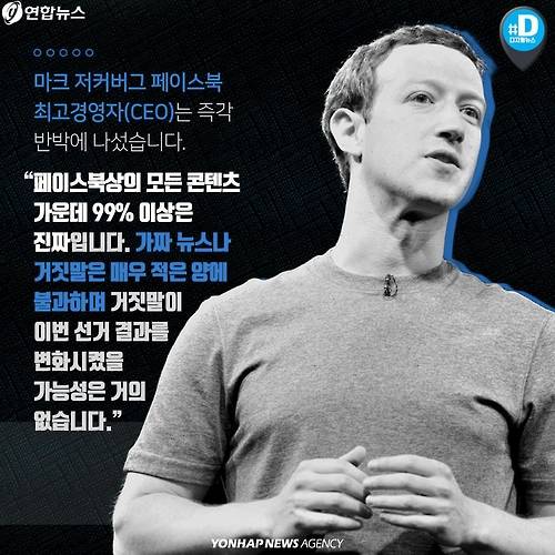“페이스북상의 모든 콘텐츠 가운데 99% 이상은 진짜입니다. 가짜 뉴스나 거짓말은 매우 적은 양에 불과하며 거짓말이 이번 선거 결과를 변화시켰을 가능성은 거의 없습니다.”그러나 인터넷 매체 버즈피드에 따르면 미국 대선일(11월 8일)을 앞둔 3개월간, 미국 주요 언론사가 생산한 진짜 뉴스보다 가짜 뉴스가 페이스북에서 더 많은 관심을 끌었습니다.