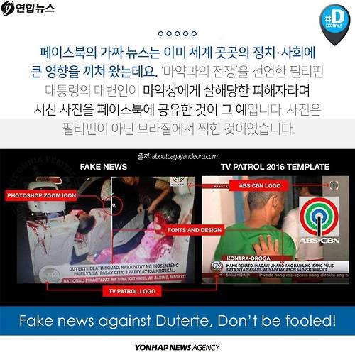 페이스북의 가짜 뉴스는 이미 세계 곳곳의 정치·사회에 큰 영향을 끼쳐 왔는데요. ‘마약과의 전쟁’을 선언한 필리핀 대통령의 대변인이 마약상에게 살해당한 피해자라며 시신 사진을 페이스북에 공유한 것이 그 예입니다. 사진은 필리핀이 아닌 브라질에서 찍힌 것이었습니다.