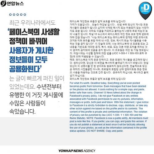 최근 우리나라에서도 ‘페이스북의 사생활 정책이 바뀌어 사용자가 게시한 정보들이 모두 공용화된다’는 글이 빠르게 퍼진 일이 있었는데요. 수년전부터 유행한 이 거짓 게시물에 수많은 사람들이 속았습니다.