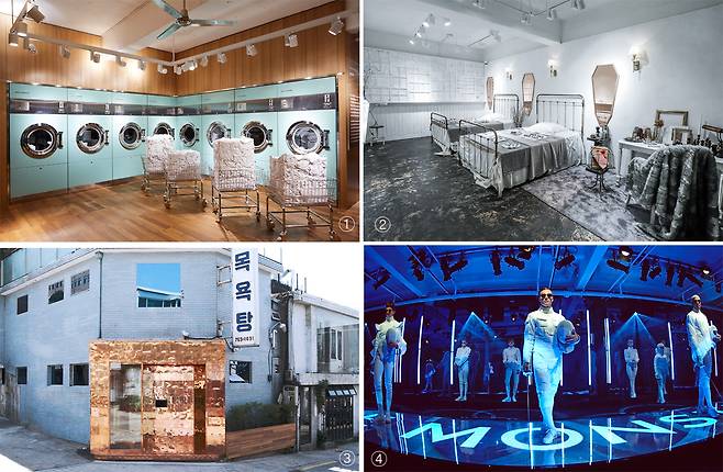 젠몬의 실험은 공간으로도 이어진다. 작년 5월 문 연 서울 계동 쇼룸은 50년 가까이 주민들이 애용한 '중앙탕'을 개조했다. 하늘색 목욕탕 타일을 원형 그대로 살렸다. 수영장을 개조하면서 바닥 타일을 보존시킨 파리 에르메스 세브르 매장보다도 한 단계 진화시켰다. 물 끓이는 기계를 노출시켜 '에너지 전환을 보여주는 예술 설치물'로 만든 것도 인상적이다. 서울 신사동 가로수길 쇼룸은 또 다르다. 침실과 벽장, 욕조가 한가운데 놓인 화이트 톤의 욕실, 남성용 이발 의자가 놓인 바버숍을 인테리어 삼았다. 고급스러운 유럽풍 인테리어를 즐기며 선반 곳곳에 있는 안경을 골라 써볼 수 있다.