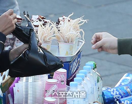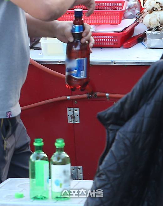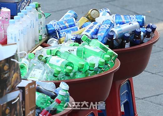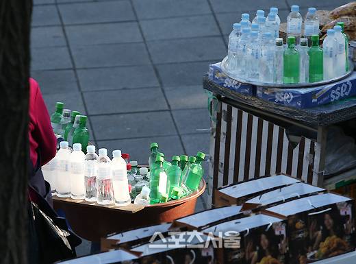 야구장 반입이 가능한 것과 가능하지 않은 것들이 다른 음료들과 함께 어우러져 진열돼 있었다. 이들 중, 반입 가능 품목은 생수와 플라스틱 맥주(1리터 이하)와 플라스틱 콜라 등이고, 소주와 캔맥주는 반입 불가 품목이었다.