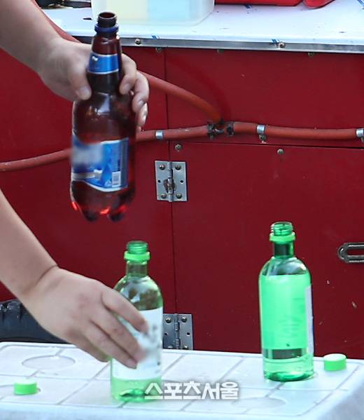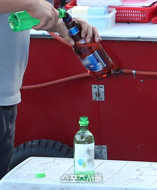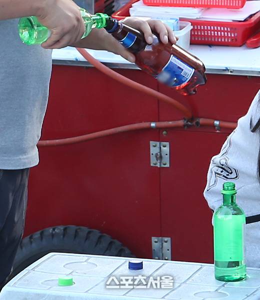 동시다발적으로 제조됐고, 새롭게 탄생한 가짜 생수(진짜 소주)는 야구팬들의 손에 옮겨졌다. 그리고 그들은, 큰 제지를 받지 않고 야구장 안으로 속속들이 입장하고 있었다. 정보가 될지 모르겠지만, 소주 한 병(가짜 생수)의 가격은 4천원, 1리터 PET 가짜 맥주는 8천원이었다.
